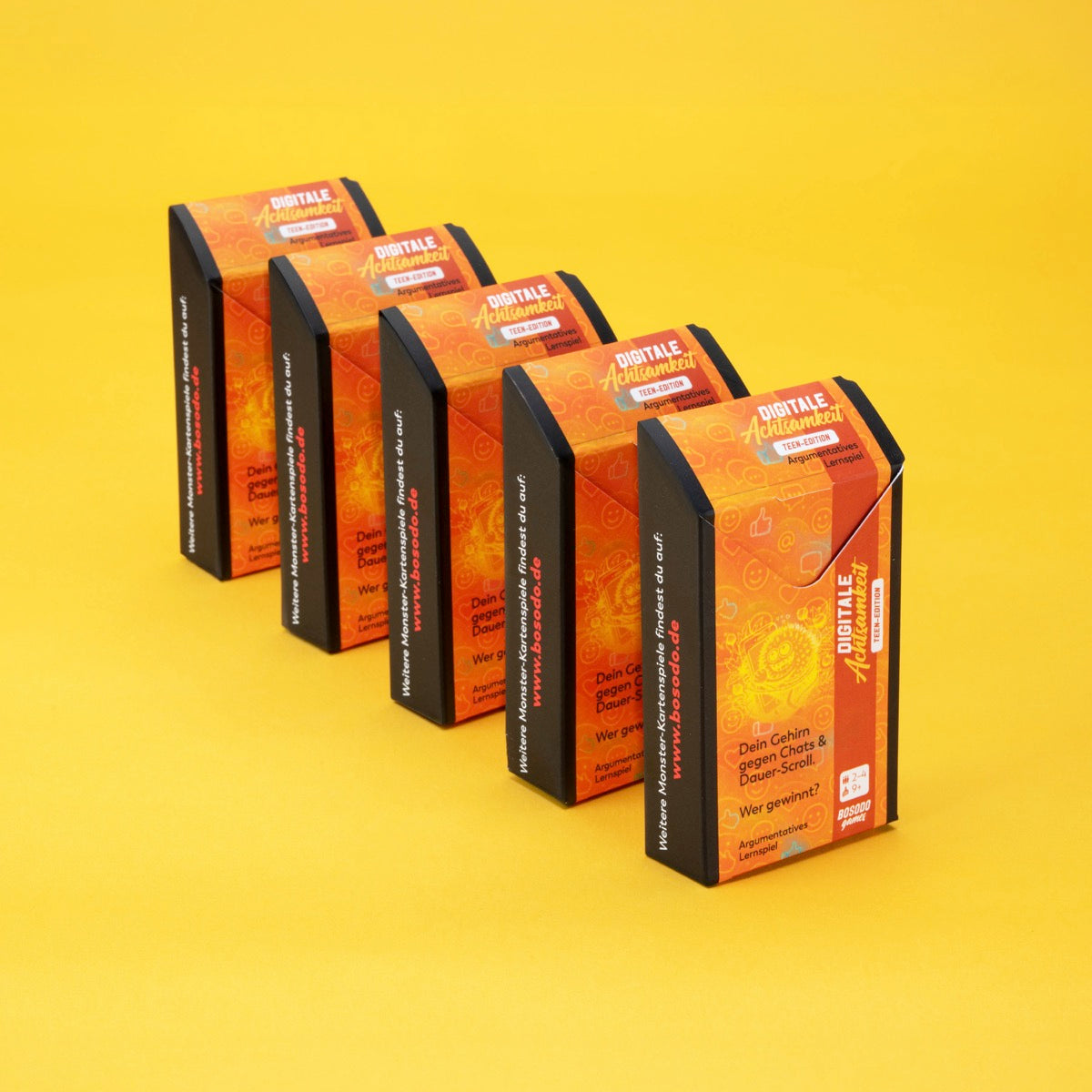 Mit unserem Kartenspiel „Digitale Achtsamkeit Teen Edition“ finden jugendliche spielerisch den Weg zu einem bewussteren Umgang mit Social Media und digitalen Medien. Am besten funktioniert das gemeinsam mit den Eltern oder in der Schule mit den Lehrern. Anstatt sich von digitalen Reizen überwältigen zu lassen, lernt man, gezielt Pausen einzulegen, sich auf das Wesentliche zu fokussieren und digitale Gewohnheiten aktiv zu reflektieren – und das gemeinsam mit anderen!
